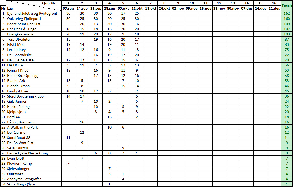 For fyrste gong i haust skulle det ikkje verta spaning om sigeren. Med 75 poeng og heile sju poeng føre dei nest beste var Quizteleg Fjolleparti heilt suverene i kveld, og Arve kunne halde fram feiringa av ei stor veke med bestått fagbrev. Hurra og kudos. Då kunne dei altså kosta på seg å svara Ronald Hoeman på biletet av Ronald Koeman, og få feil av ein streng Evertonfan i baren. Langt tettare blant laga bak vinnarlaget: Kun 3 poeng skilde nummer 2 frå nummer 8. Og det var to gamle travarlag som skulle ta steget opp på pallen denne gong. Stord BTK har slitt fælt i haust, og har trua med å slutta å gå på quiz. Heldigvis er dei med framleis, og kunne i kveld innkassera ein fin andreplass. Det ryktast at spesielt Lars Åge var på tåhev i dag. Kanskje hadde dei nådd heilt til topps dersom Thor-Egil hadde vert med? Á poeng men éitt meir bilete enn Lex Lodney (framleis med berre tre på laget) vart utslagsgjevande. Honnør til LL for den sterke tredjeplassen! Poenget bak pallen fann me tre lag: Quizzvazz, som endeleg stilte med fleire enn to deltakerar (bra!), Bedre Seint Enn Sist og Dei Hjelpelause (som nærmar seg pallen no). Gratulera til vinnarlaga!